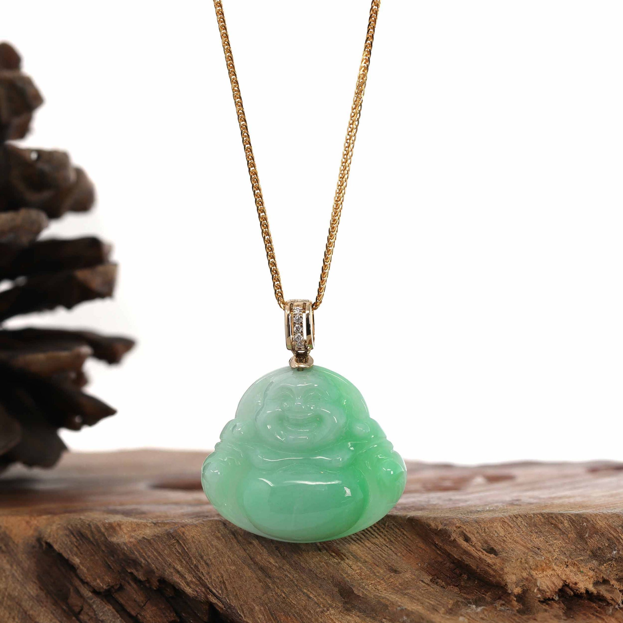 * Detail--- One-of-a-kind jadeite Buddha necklace, inspired by the figure of the traditional Buddha body. Combined with a modern VS1 diamond bail. The piece is more than perfect for daily wear. Wearing items bearing the image of Buddha can remind us to be like Buddha in our daily life. Such items may also encourage us to be more patient in approach, kind in nature, and cultivate thoughts of peace and non-violence. Made with 100% genuine jadeite jade, untreated. Jadeite represents good luck, prosperity, and wealth. Handcrafted, with a lot of attention to detail.