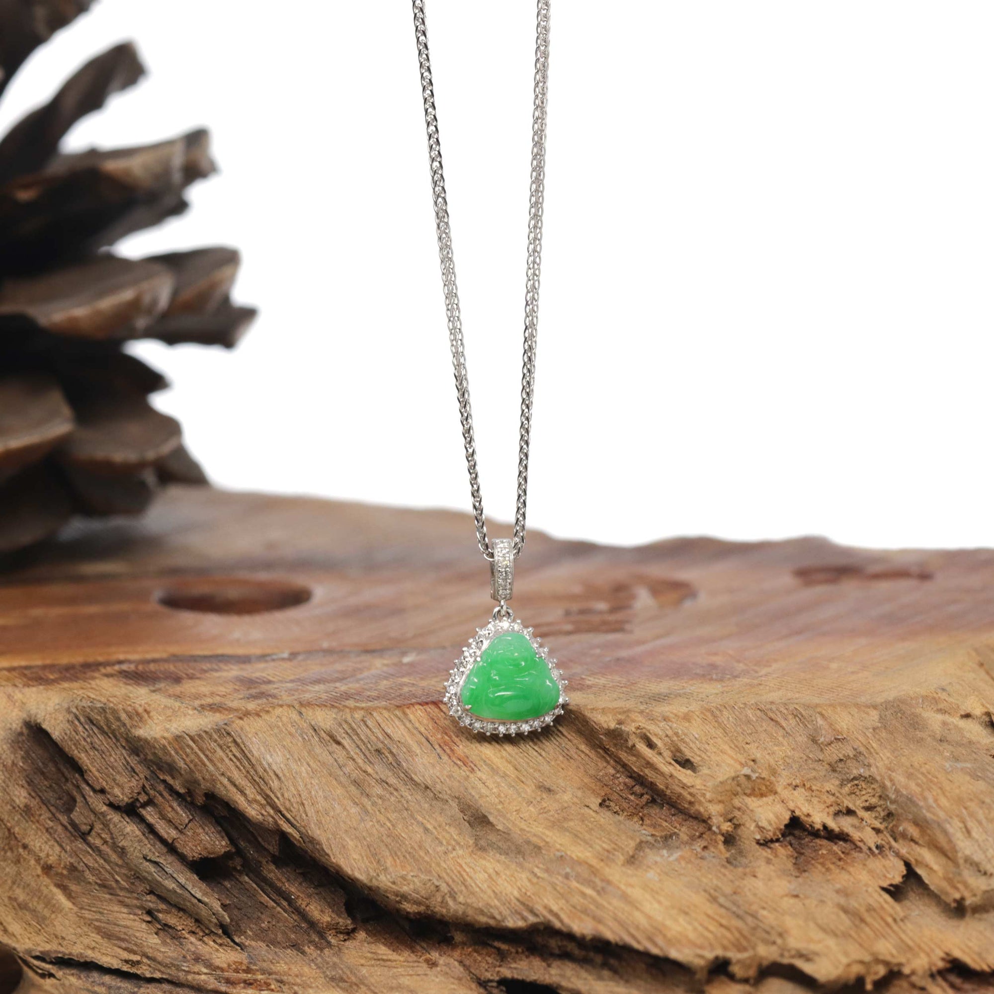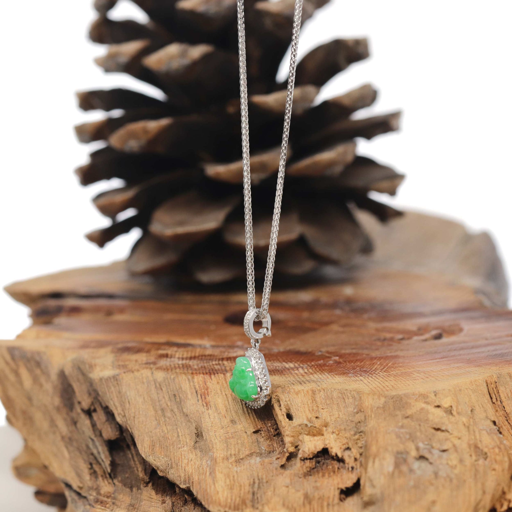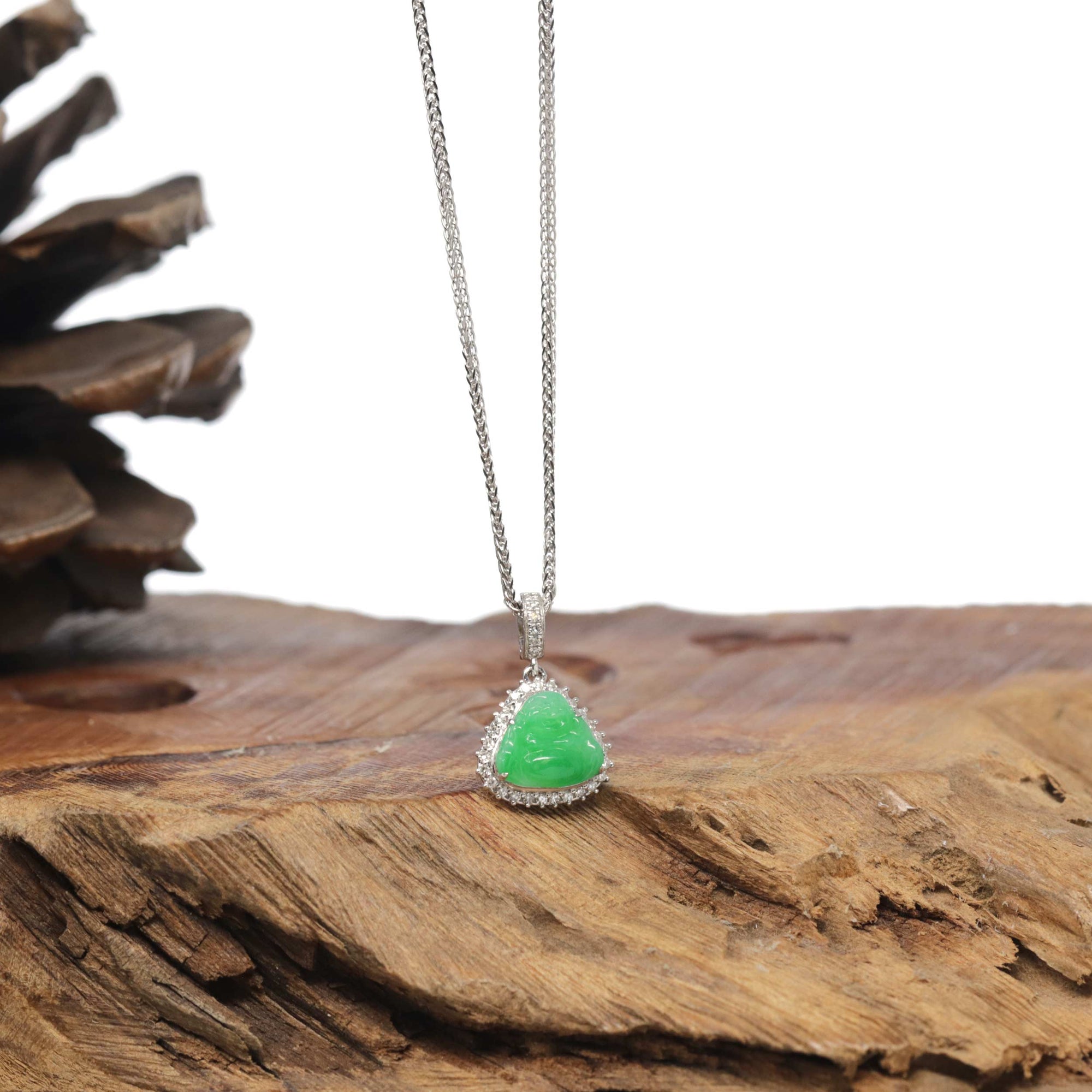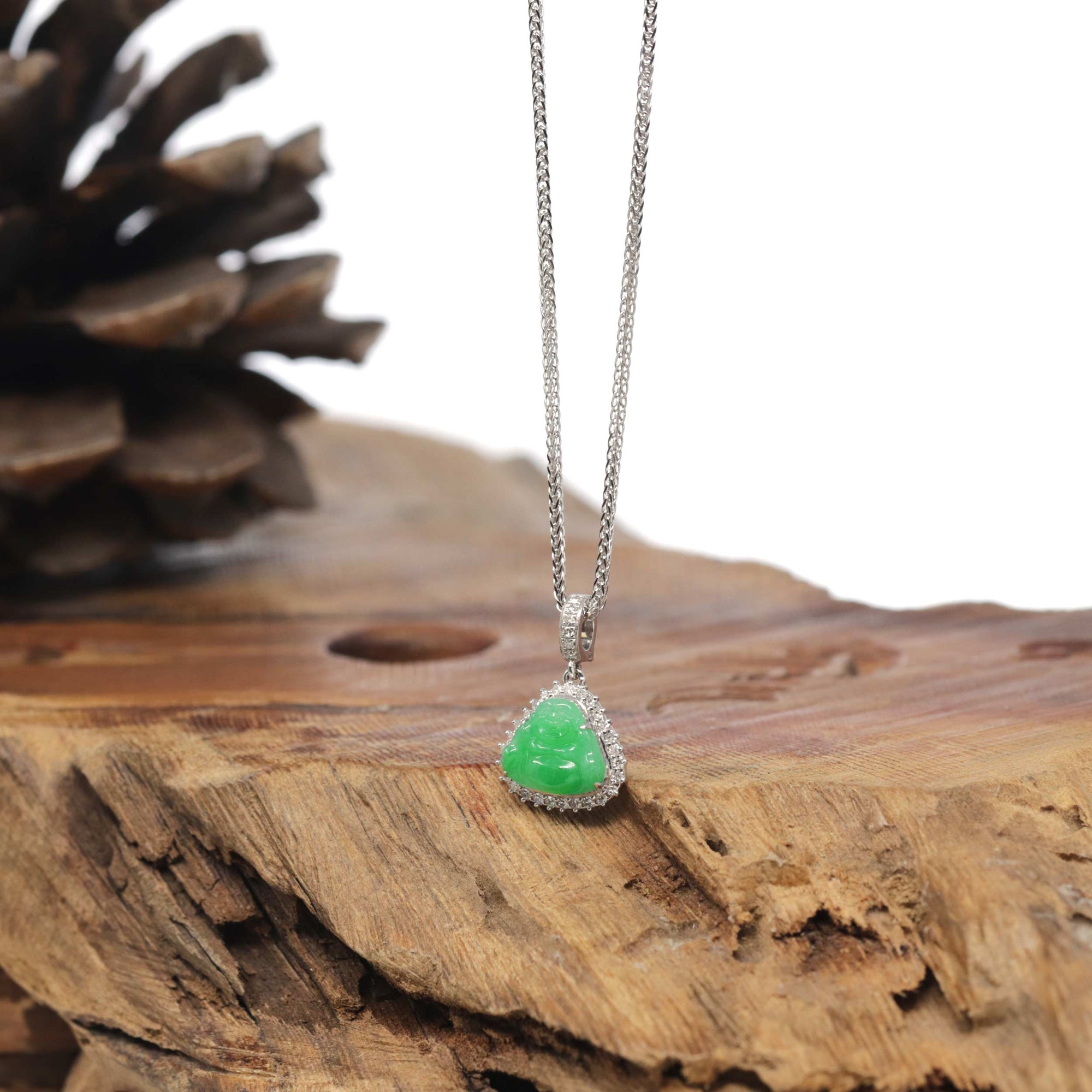 Baikalla 18K White Gold "Happy Buddha" Vibrant Green Jadeite Jade Pendant W/ Natural Diamonds