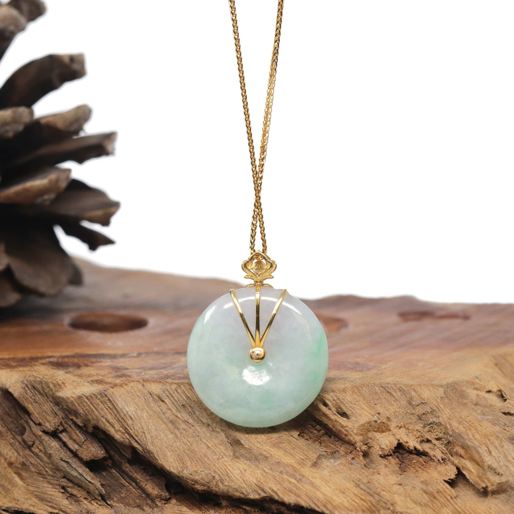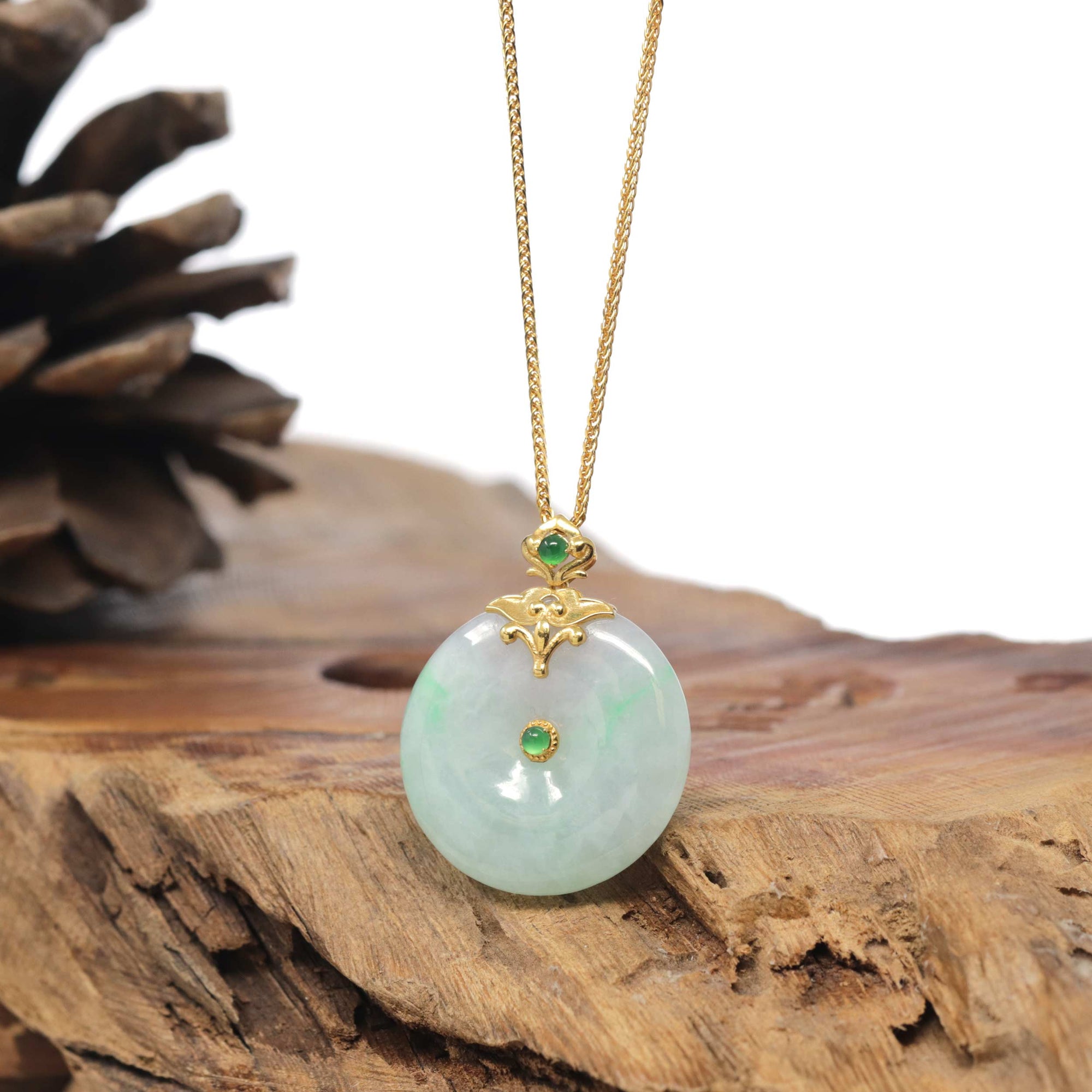Baikalla 18K Yellow Gold "Ping An Kou" (Good Luck Button) Natural Icy Light Blue-Green Flowers Jadeite Jade Pendant