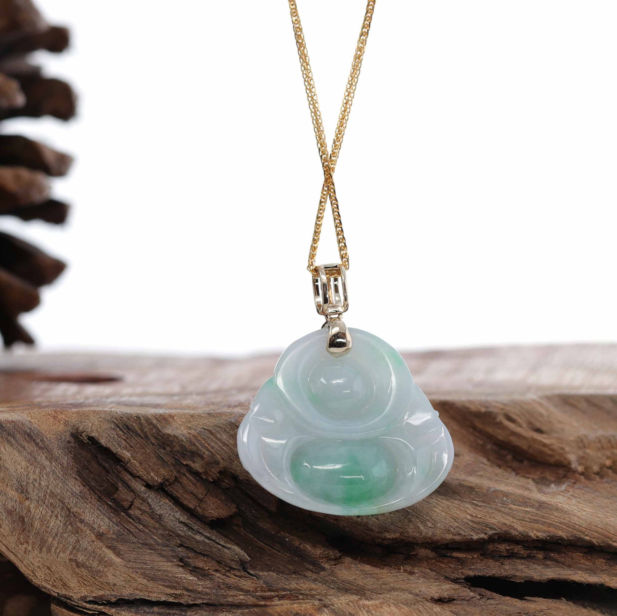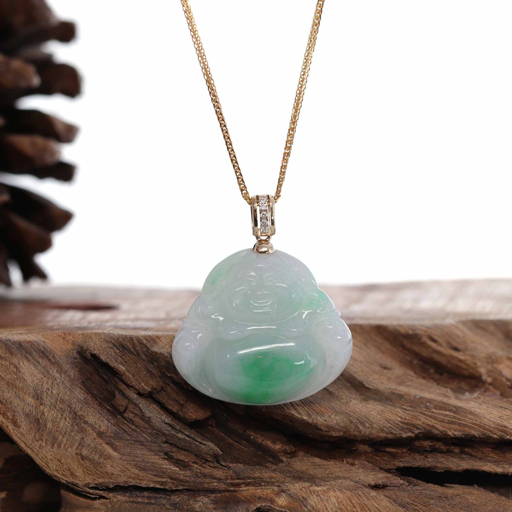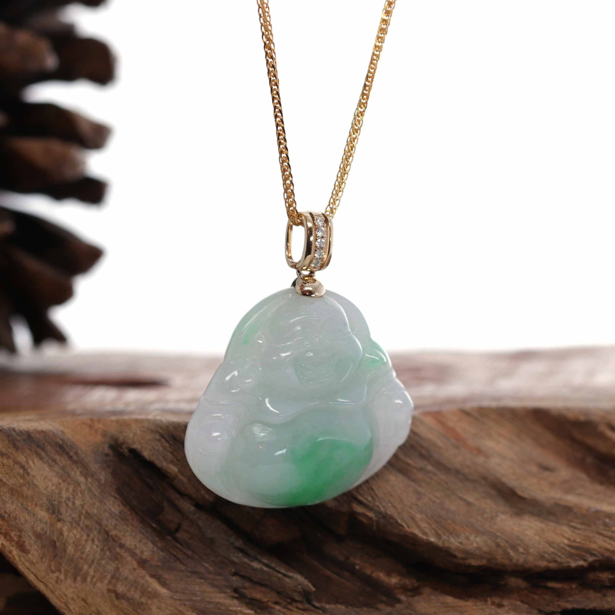 Baikalla™ "Laughing Buddha" Genuine Green Jadeite Buddha Necklace With 14k Yellow Gold Diamond Bail