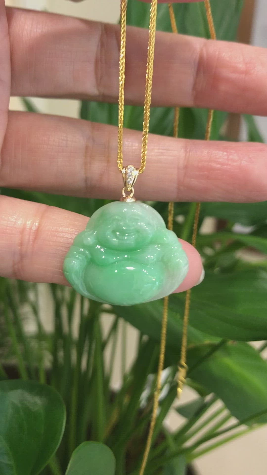 Baikalla™ "Laughing Buddha" Genuine Green Jadeite Buddha Pendant Necklace With 18k Yellow Gold Diamond Bail