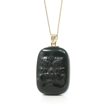 Baikalla 14k Yellow Gold "Goddess of Compassion" Genuine Black Burmese Jadeite Jade Guanyin Necklace With Gold Bail