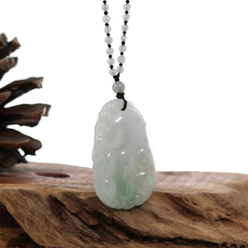 Genuine Ice Blue-Green Jadeite Jade "Good Luck Oval with Dragon Accent" Pendant Necklace With Real Jadeite Bead Necklace