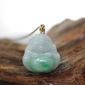 "Laughing Buddha" Large 14k Yellow Gold Genuine Green Jade Buddha Pendant