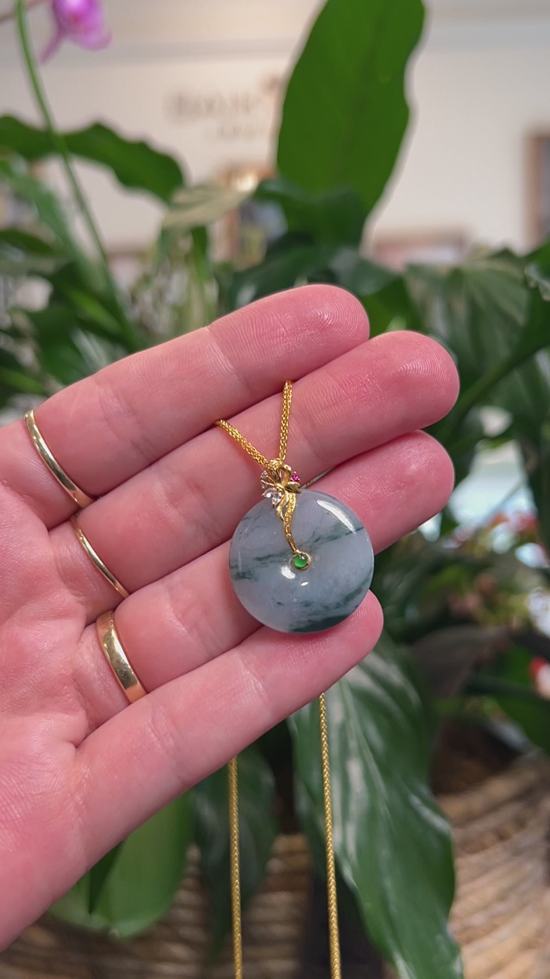 Baikalla 18K Yellow Gold "Ping An Kou" (Good Luck Button) Natural Deep Blue-Green Flower Jadeite Jade Pendant W/ Natural Diamonds & Ruby