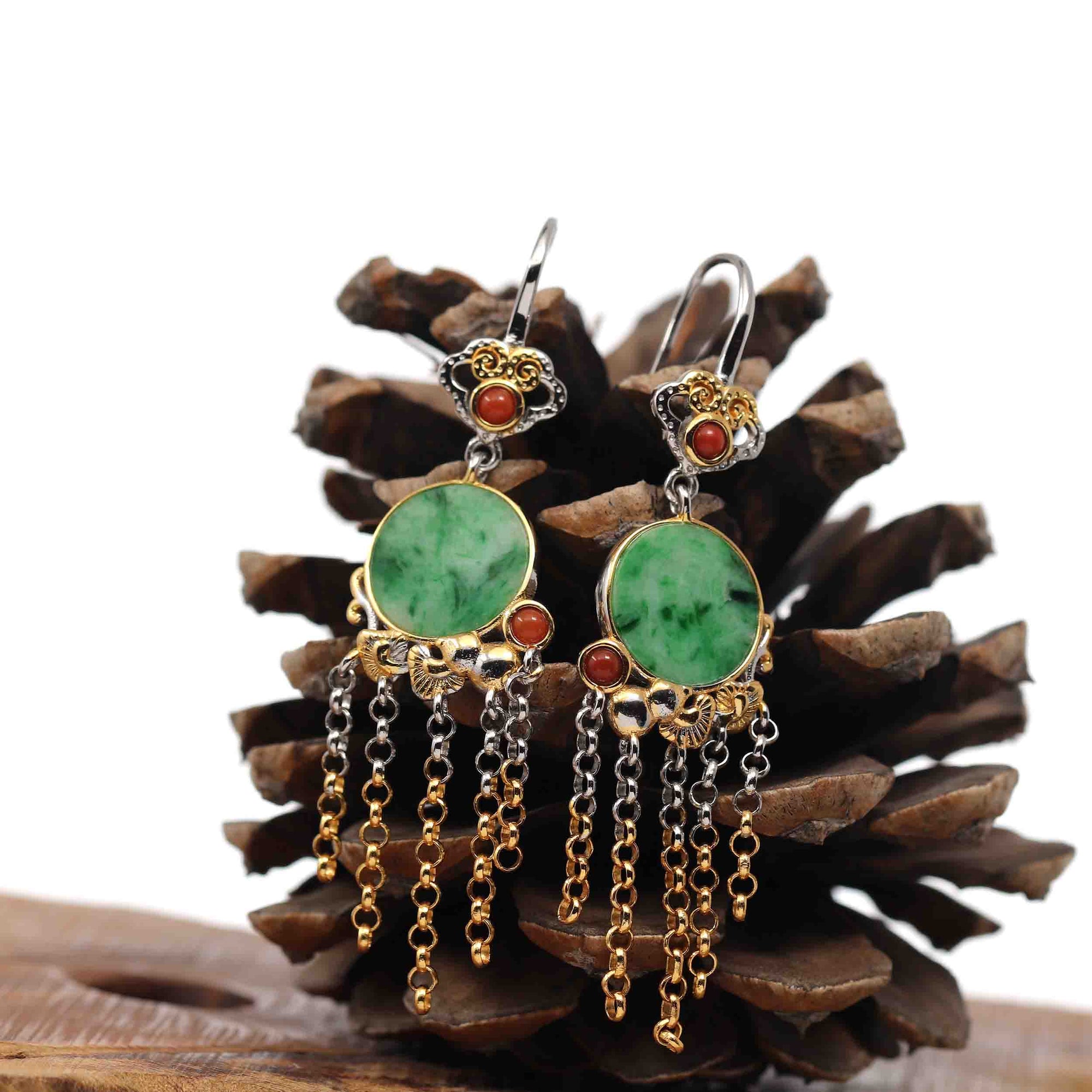 Baikalla Antique Natural Jadeite Jade Sterling Silver Gold Plated Two Tone Dangle Earrings