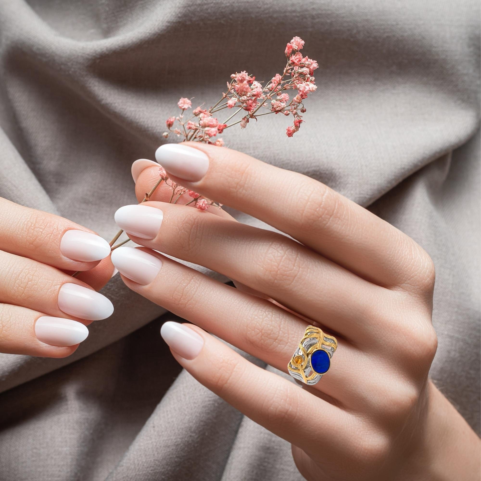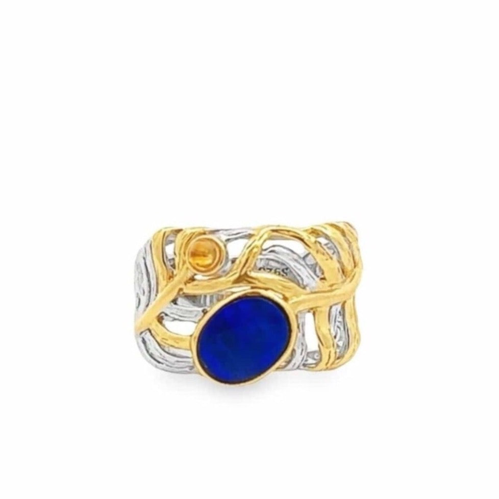 Baikalla Antique Natural Lapis and Agate Sterling Silver Gold Plated Two Tone Ring