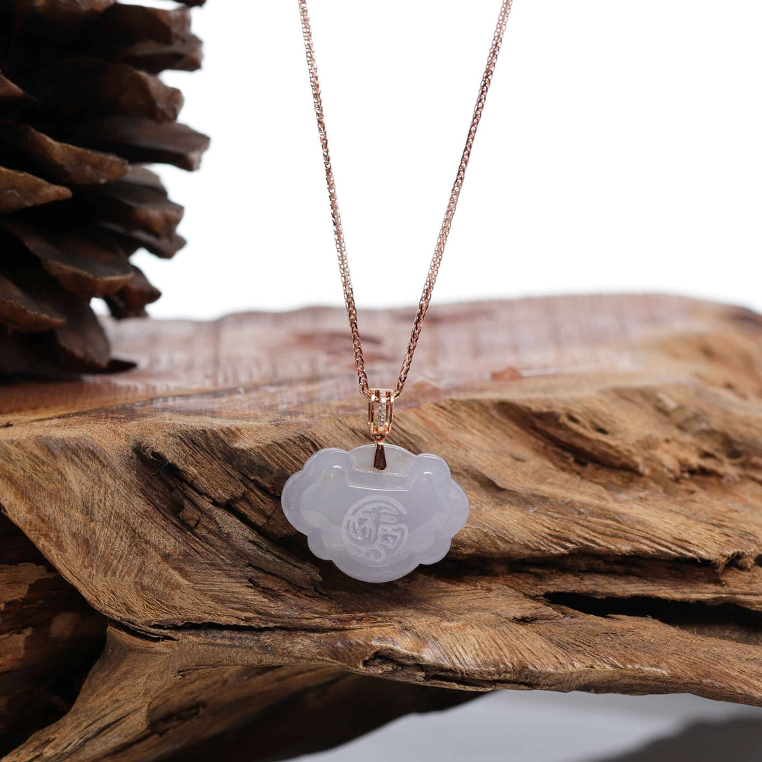 18k Rose Gold Genuine Burmese Lavender Jadeite Happiness ( Fu & Pingan ) Pendant Necklace