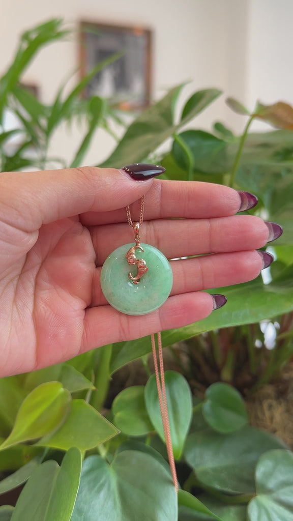 * INTRODUCTION--- Elevate your style with our 18k Rose Gold Genuine Jadeite Constellation Pisces Necklace with Diamonds, a stunning fusion of elegance and celestial symbolism.  The pendant's design is inspired by the Pisces constellation, which depicts two fish swimming in opposite directions, symbolizing the depth and complexity of Pisces individuals. Jadeite gem is meticulously cut, revealing its natural beauty and charm, while the accent diamonds enhances its timeless appeal. Whether you're a proud Piscean or want to honor someone special born under this sign, this necklace is a symbol of adaptability, duality, and elegance that will be cherished for a lifetime.