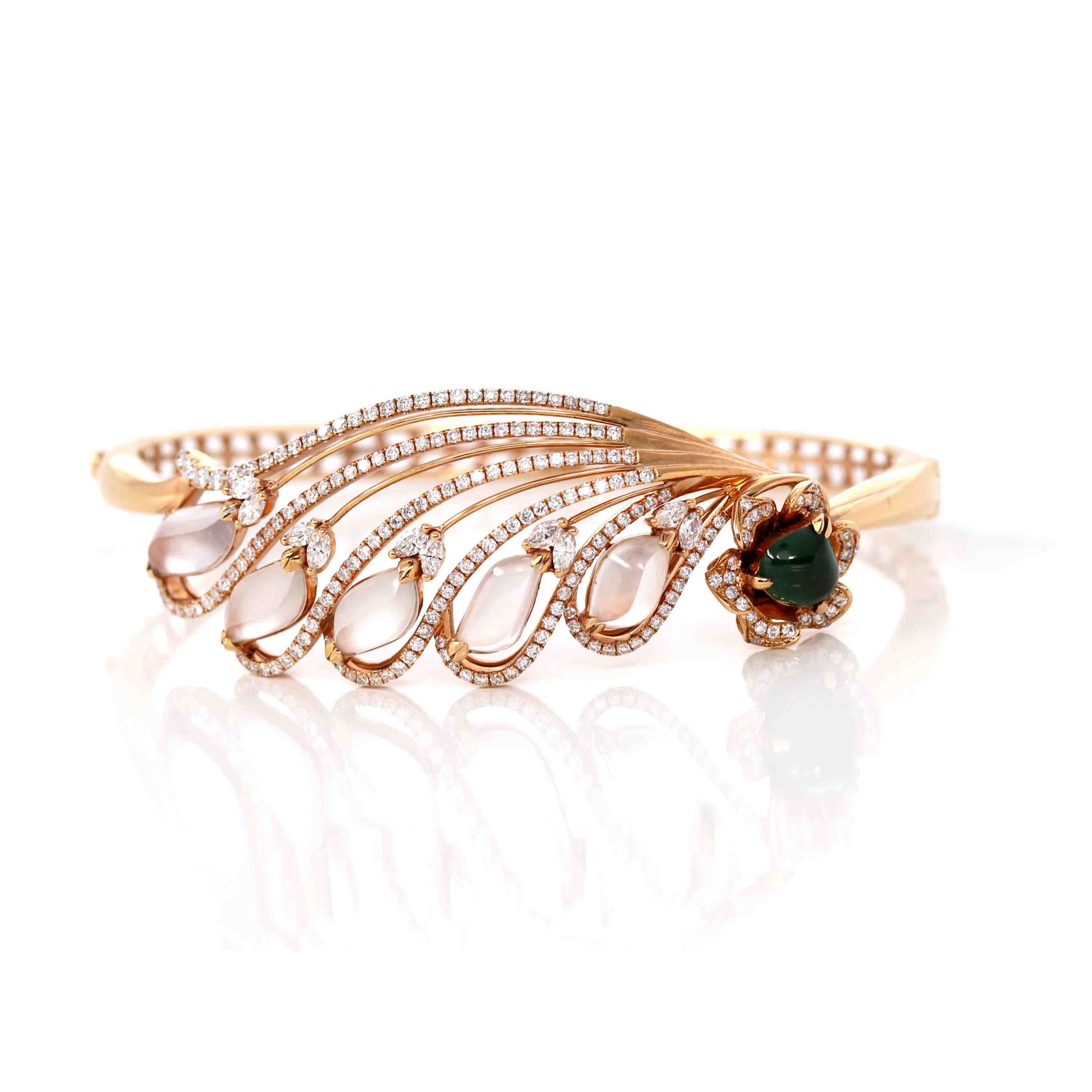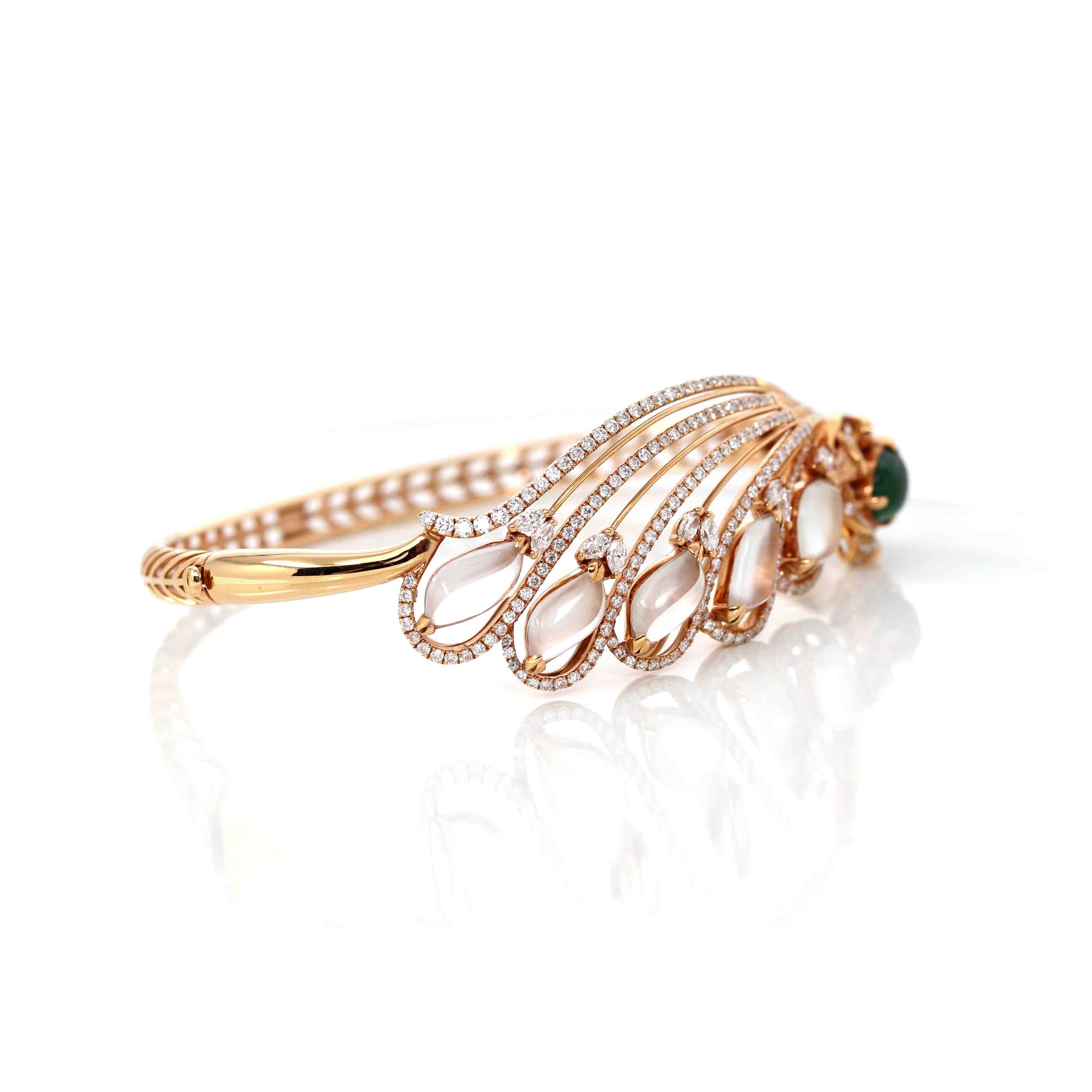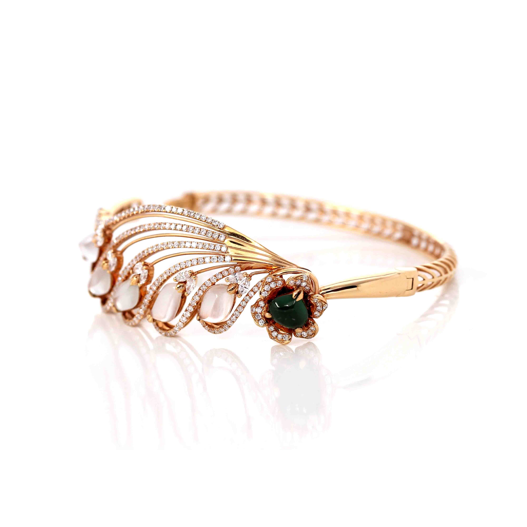* DESIGN CONCEPT--- The design is inspired by Phoenix. Symbolizing life, prosperity, and good fortune with the natural ice jade stones. This 18k Rose Gold Genuine Jadeite Jade Bangle Bracelet is a luxury you can wear daily. This collectible fashion style bangle is made with very high-quality genuine ice and imperial green jadeite. The jadeite texture is transparent and absolutely amazing. Handmade by expert craftsman, every detail and angle is exquisite. Dazzled with diamonds. The bangle is beautiful with perfect texture jadeite.  It's a very special gift for yourself or your love.