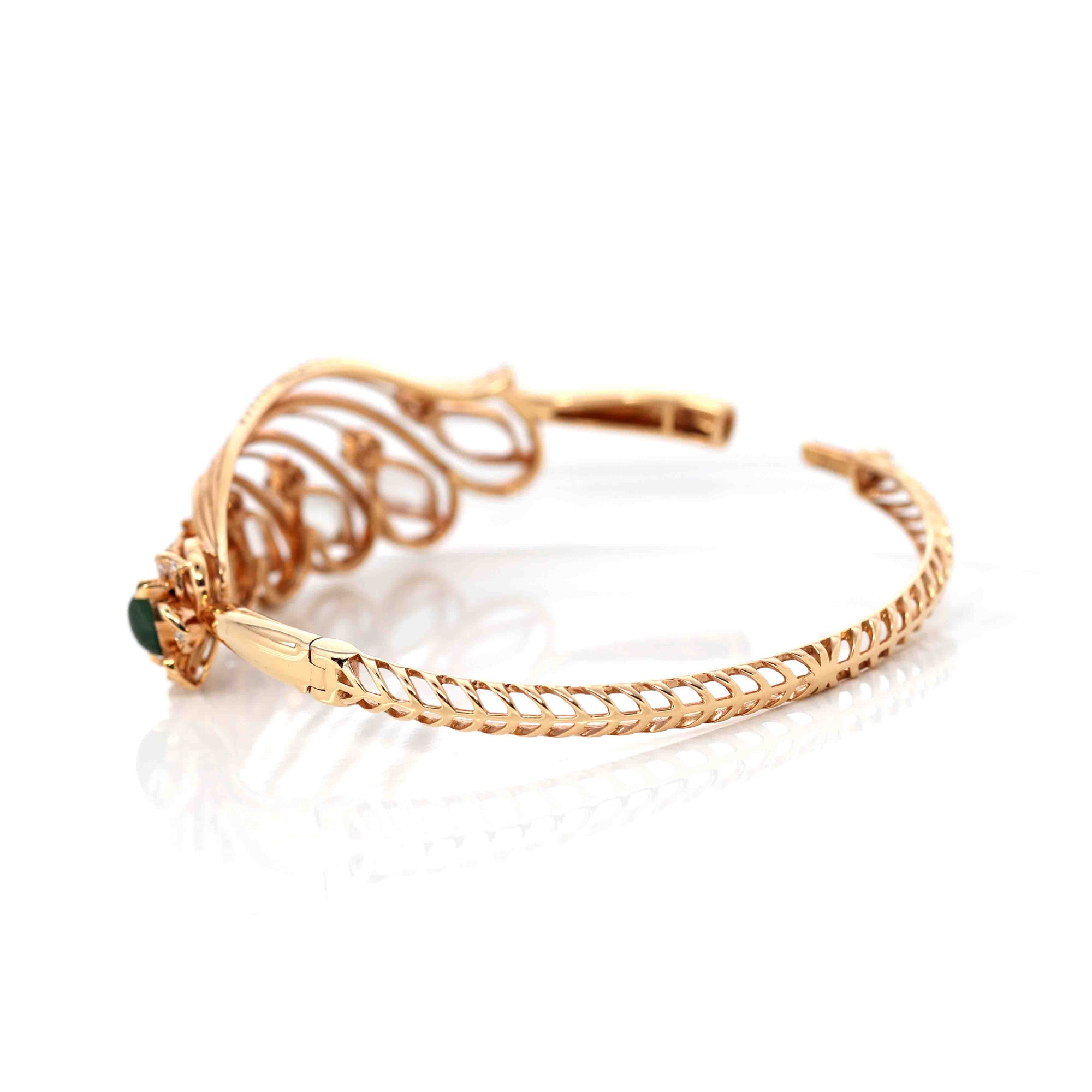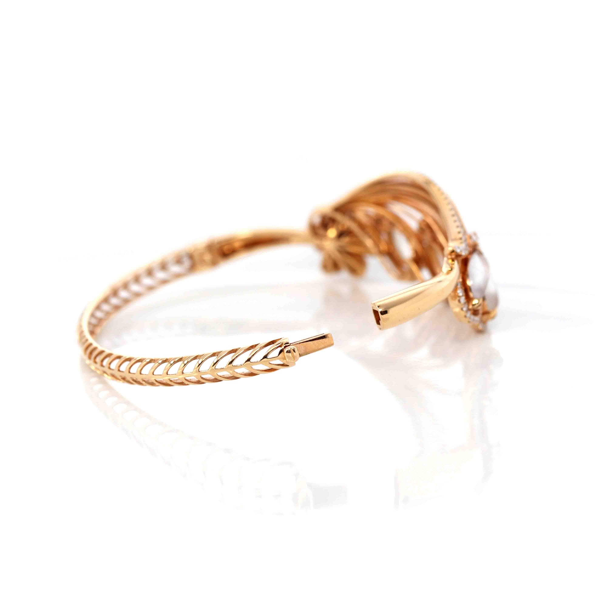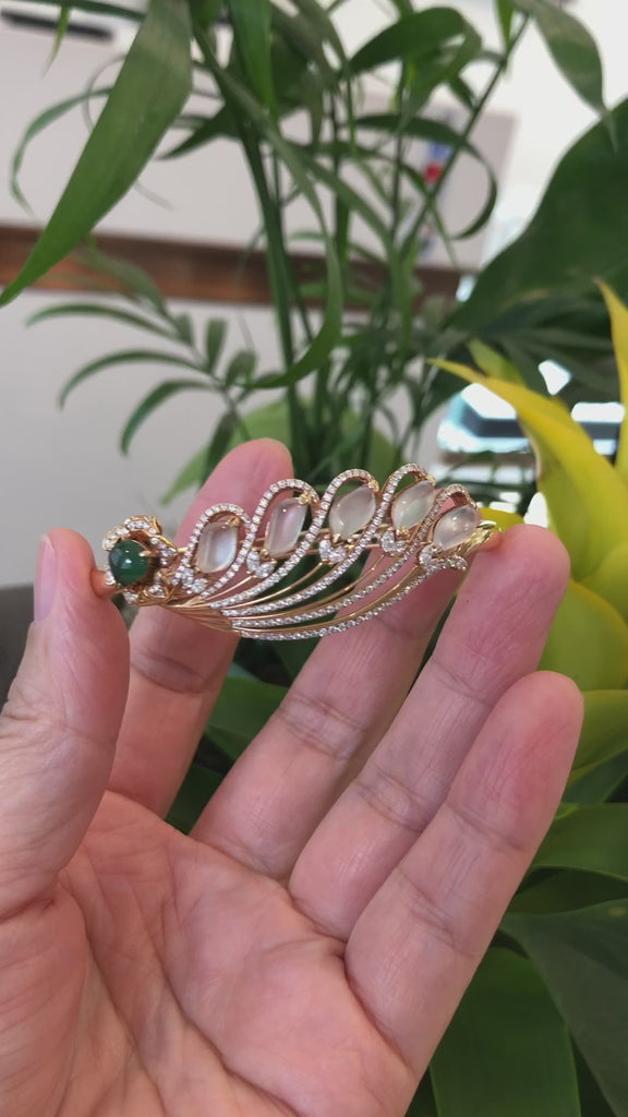 * DESIGN CONCEPT--- The design is inspired by Phoenix. Symbolizing life, prosperity, and good fortune with the natural ice jade stones. This 18k Rose Gold Genuine Jadeite Jade Bangle Bracelet is a luxury you can wear daily. This collectible fashion style bangle is made with very high-quality genuine ice and imperial green jadeite. The jadeite texture is transparent and absolutely amazing. Handmade by expert craftsman, every detail and angle is exquisite. Dazzled with diamonds. The bangle is beautiful with perfect texture jadeite.  It's a very special gift for yourself or your love.