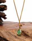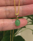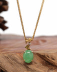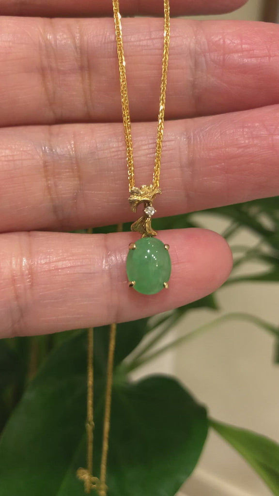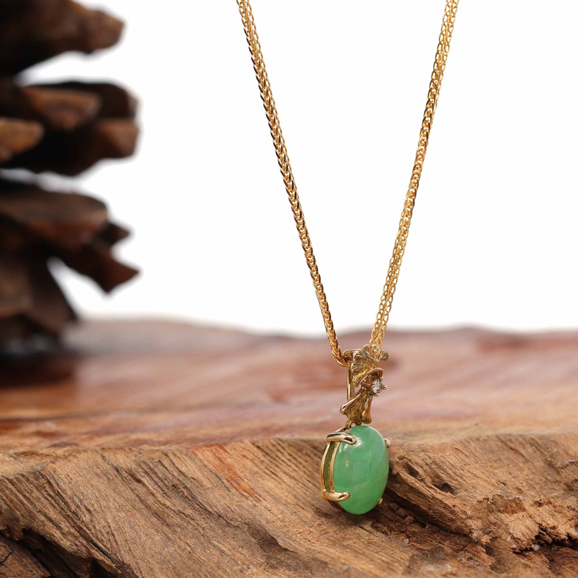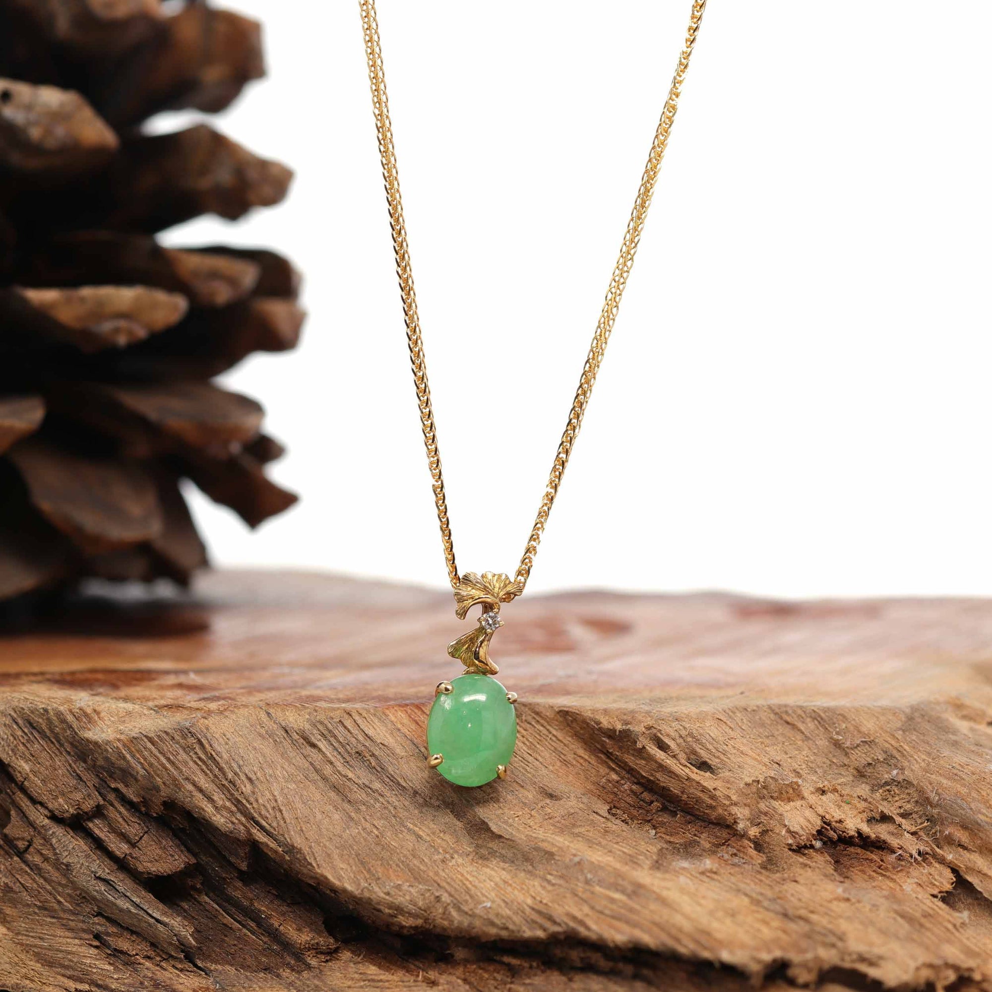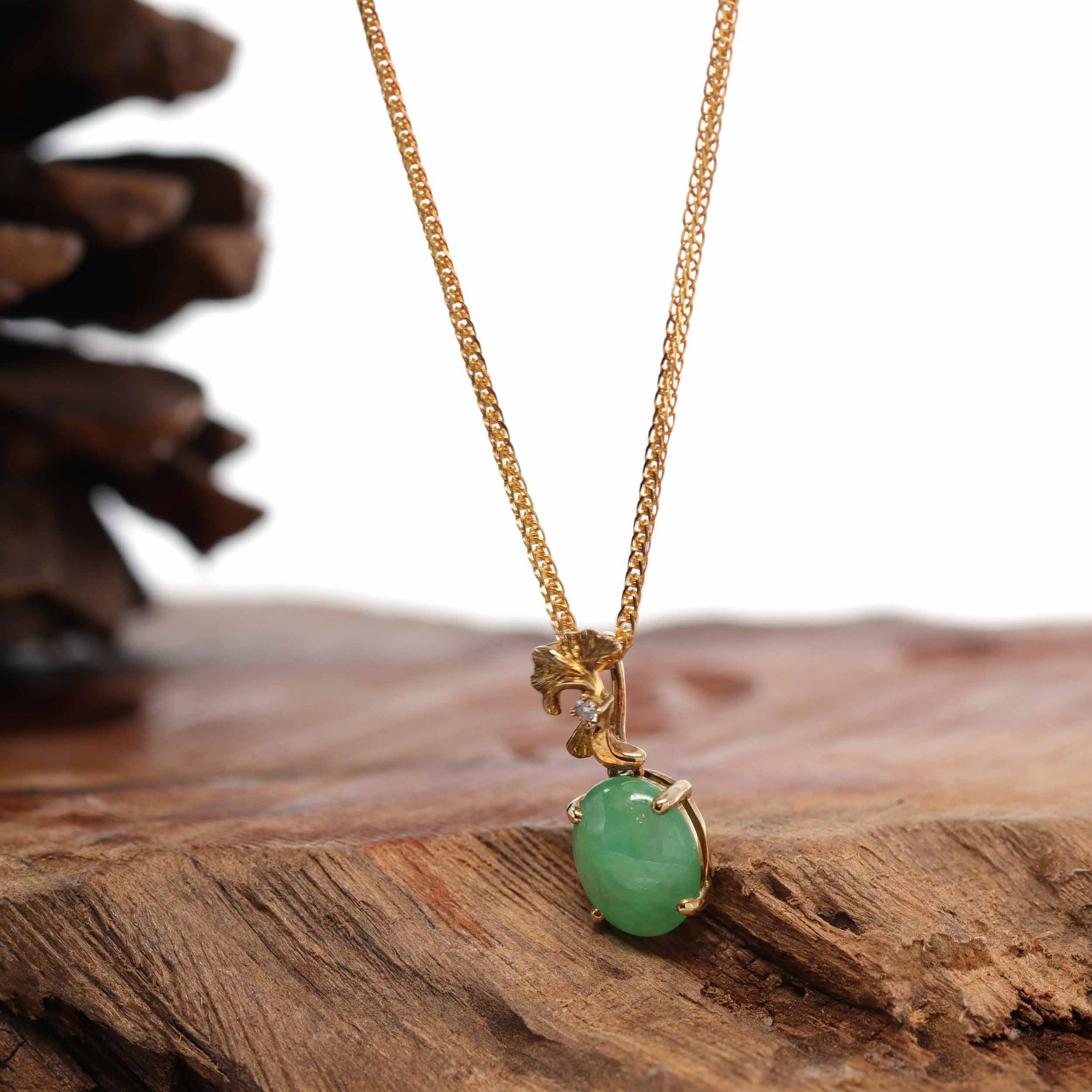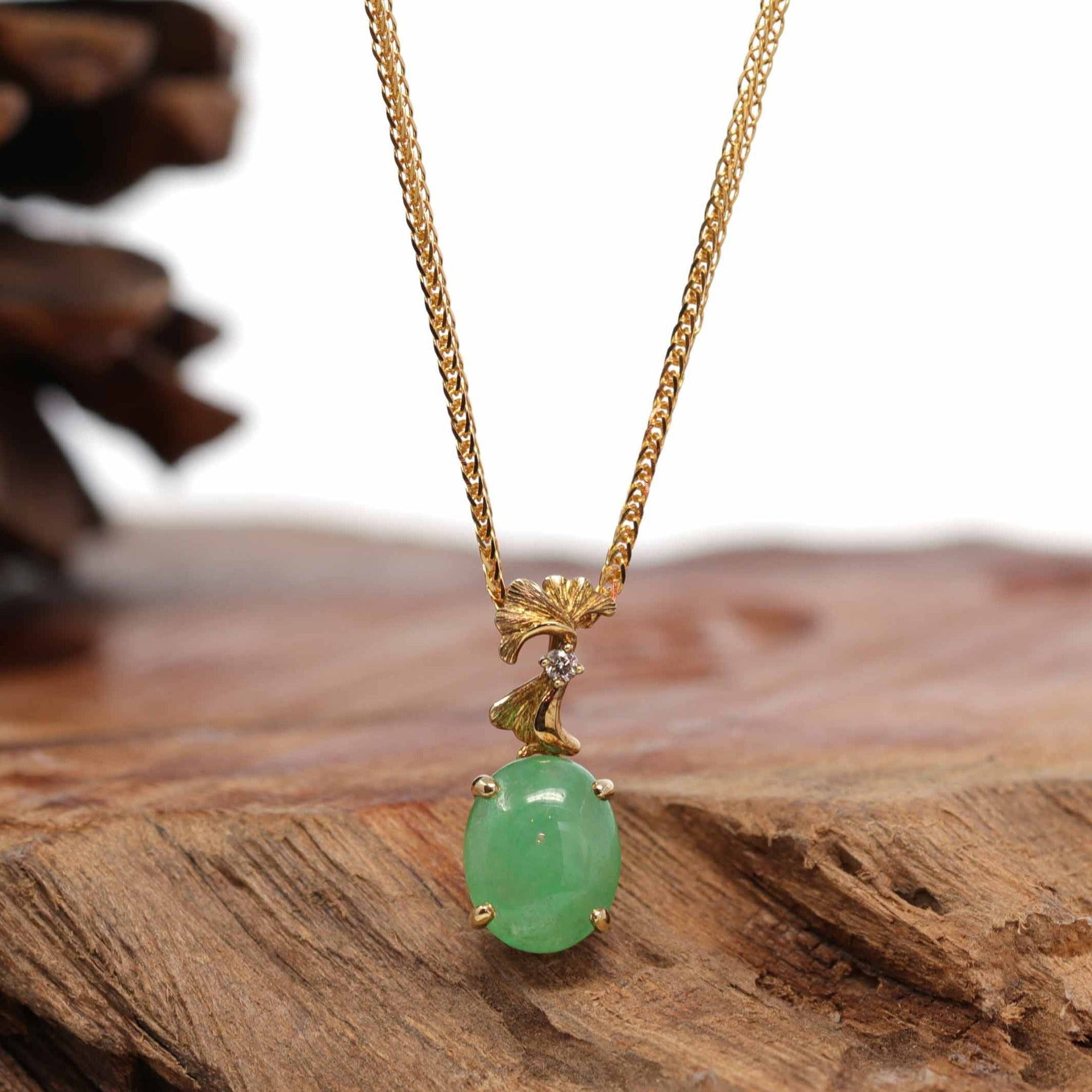 18K Yellow Gold "Ginkgo Leaf" Oval Apple Green Jadeite Jade Cabochon Necklace with Diamonds