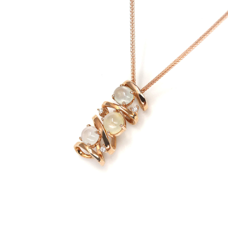 Design Concept: --- This necklace puts a modern twist on the rare and gorgeous ice jadeite from Burma. Traditionally used as main stones on rings. This necklace combines three stones in an elegant fashion. Design of an infinity knot in the middle symbolizes your forever love. This piece is made with 18k rose gold and accented with diamonds. The translucent jadeite jade is very rare and hard to come by. The 18k rose gold goes very very well with the white stone. Wearing it you will be the focus at any occasion.