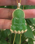 DETAILS--- 14K Yellow Gold Genuine Nephrite Luxury Apple Green Jade Guanyin Pendant Necklace. This pendant is made with very high-quality genuine apple green jade, The green jade texture is so smooth and translucent. It's very perfect without flaws. The handcraft is excellent, And the Guanyin is holding a vase with holy water in her hand. You can feel the Guanyin is very kind to you. It's completely beautiful and affordable with perfect apple green nephrite jade. and you can see the design with a special symbol lotus and VVS1 diamonds halo of Buddha. It's a great size 48.46 *27.11 mm for men or women! It's a very significant gift for yourself or your love.
