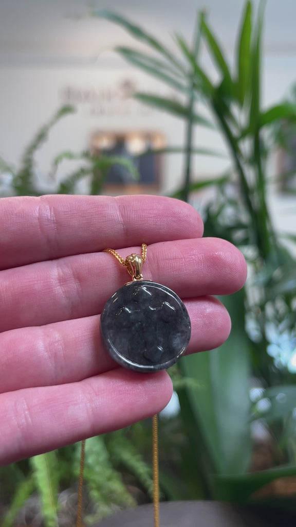 * Design Concept--- This round pendant features natural Burmese jadeite jade, intricately carved with a classic cross design. The jade is an icy black Wuji color throughout, with a smooth and translucent texture. Wuji (乌鸡), meaning “black chicken,” refers to the distinctive blackish-grey coloration prized in jadeite. Finished with a solid 18K yellow gold bail, this pendant is both meaningful and elegant, making it a thoughtful gift for yourself or someone you love.
