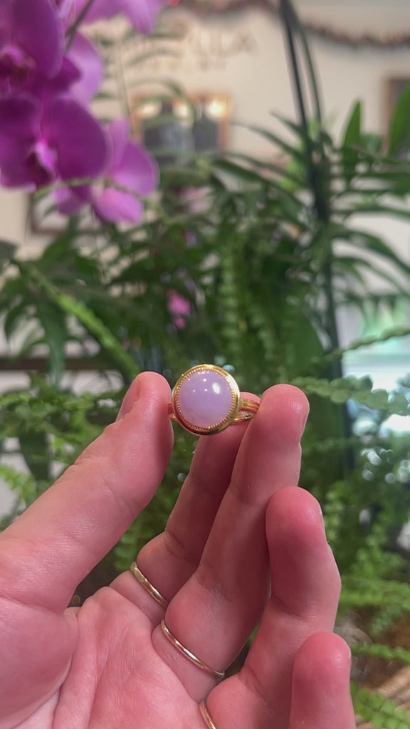 * DESIGN --- This natural purple-lavender Burmese jadeite jade ring features a classic, timeless design with an 18k yellow gold bezel-set center stone framed by delicate milgrain gold detailing. The jade displays even color, soft translucency, and a beautifully smooth texture. Known for its durability, jadeite is also believed to bring good luck. This ring makes a thoughtful and meaningful gift for yourself or someone special - also makes more a gorgeous engagement or special occasion ring.