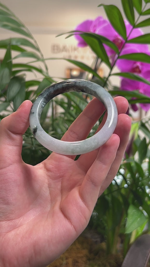 * DETAILS--- This bangle is crafted from genuine Burmese Jadeite jade that features a light blue-green base color with dark blue-green flowers and some spots of black Wuji(乌鸡) "black chicken" that makes for a unique and mesmerizing combination. The texture is smooth and translucent with some natural lines and cloudy spots that reflects the jade’s genuine character. These organic features also make this piece more accessible and affordably priced, offering exceptional beauty and value.