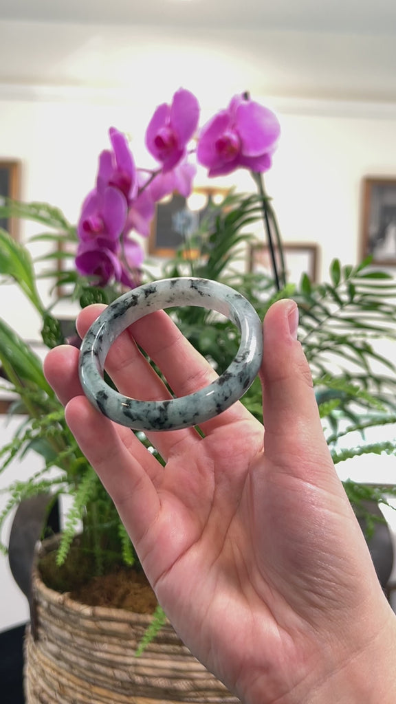 * DETAILS--- This bangle is crafted from genuine Burmese Jadeite jade that features a light blue-green color throughout with dark blue-green flowers and some spots of black Wuji(乌鸡) "black chicken" that makes for a unique and mesmerizing combination. The texture is smooth and translucent with some natural lines and cloudy spots that reflects the jade’s genuine character. These organic features also make this piece more accessible and affordably priced, offering exceptional beauty and value.