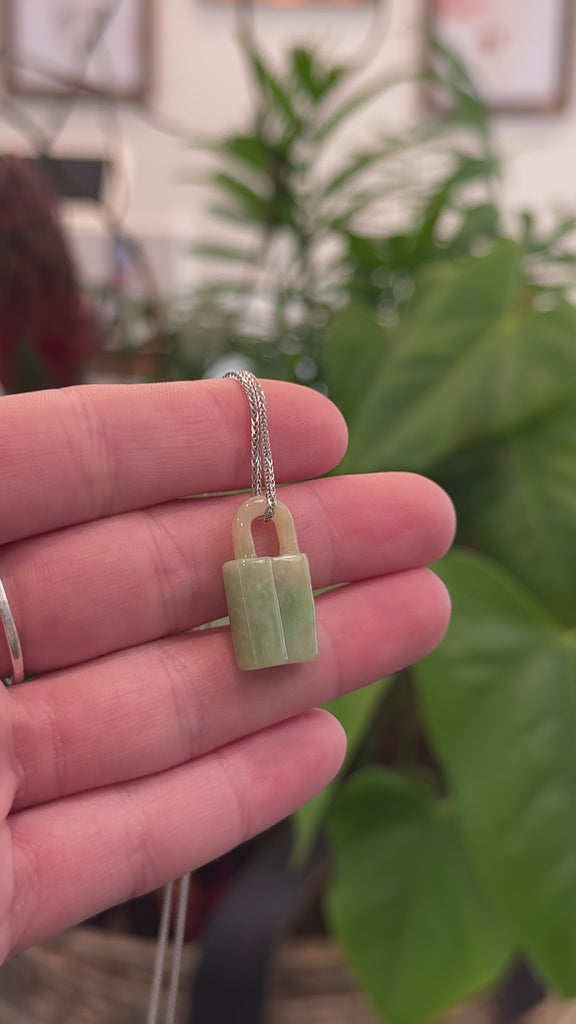* Design Concept--- Introducing Baikalla Lavender Jadeite Jade Lock Necklace Pendant. This necklace is shaped like a lock symbolizing security and commitment. The texture of jadeite jade is semi smooth with unique yellow green color. Perfect for you or your loved one.