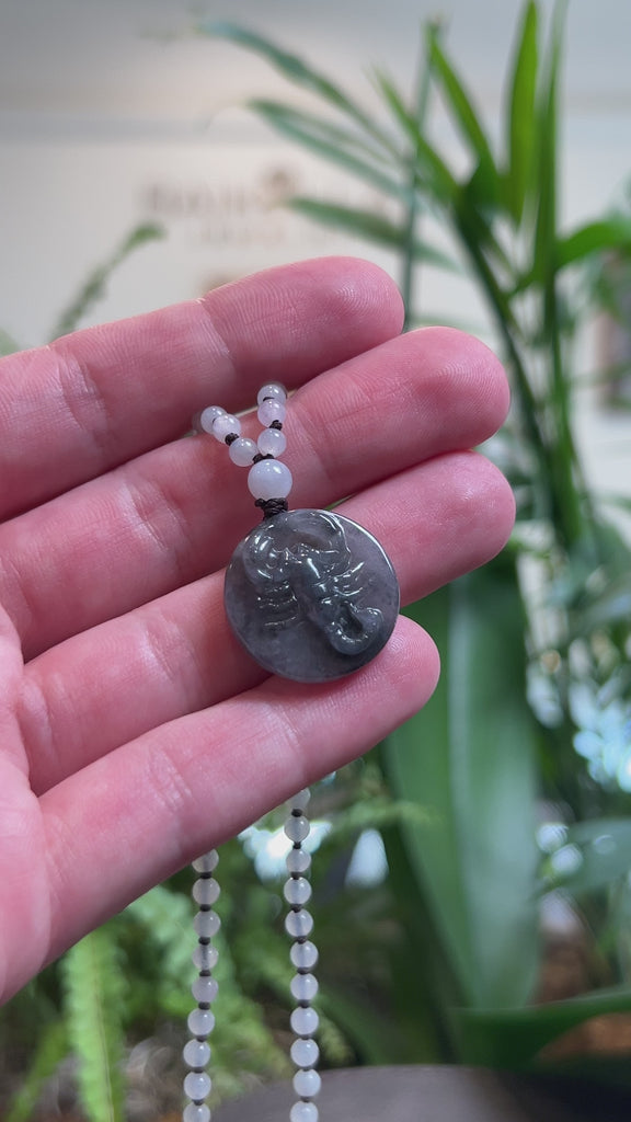 * Design Concept--- This round pendant necklace features natural Burmese jadeite jade, intricately carved with the Scorpio symbols on both sides of the pendant. The jade is an icy black Wuji color throughout, with a smooth and translucent texture. Wuji (乌鸡), meaning “black chicken,” refers to the distinctive blackish-grey coloration prized in jadeite. Finished with a beaded necklace, this pendant is both meaningful and elegant, making it a thoughtful gift for yourself or someone you love.