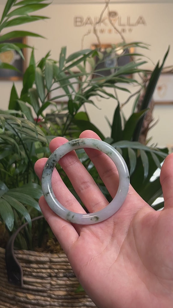 * DETAILS--- This bangle is crafted from genuine Burmese Jadeite jade. It features a semi smooth, semi translucent texture with an icy light green base color and blue-green flowers throughout. This bangle has minimal natural lines and some cloudy spots. It's a full round, traditional bangle, which is fully round throughout the bangle. Known for its durability, jadeite is also believed to bring good luck. This bangle makes a thoughtful and meaningful gift for yourself or someone special.