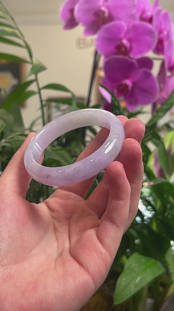 *DETAILS--- This bangle is crafted from natural Burmese Jadeite jade that features a vibrant "Vixen" lavender purple color throughout with a light green patch. The texture is smooth and translucent with no natural lines and minimal cloudy spots, including a small brown spot that reflect the jade's genuine character.