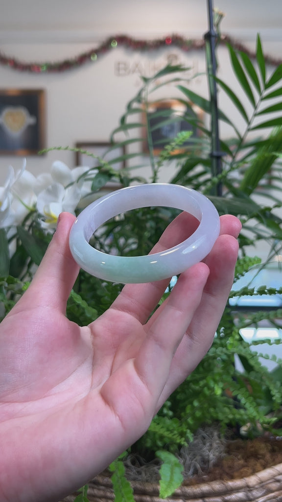 *DETAILS--- This bangle is crafted from natural Burmese Jadeite jade that features an icy white color throughout, with a soft apple-green patch. The texture is silky smooth and translucent with no natural lines and minimal cloudy spots.