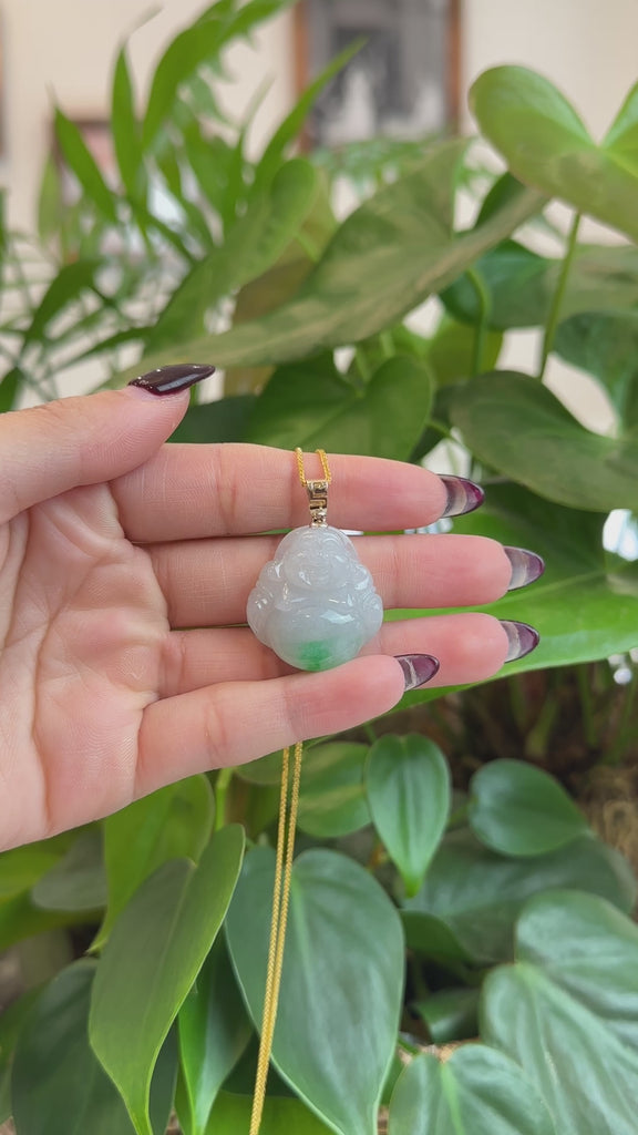 * INTRODUCTION--- Introducing the Baikalla "Laughing Buddha" 14K Gold Genuine White Green Jadeite Jade, a magnificent fusion of cultural symbolism and timeless elegance. The centerpiece of the pendant is a genuine green jadeite jade, carefully carved into the iconic Laughing Buddha figure, known for their enlightenment, mentorship, and protection. Elevate your style with a touch of spirituality and sophistication, with our 14k gold "Laughing Buddha" pendant, an essential piece