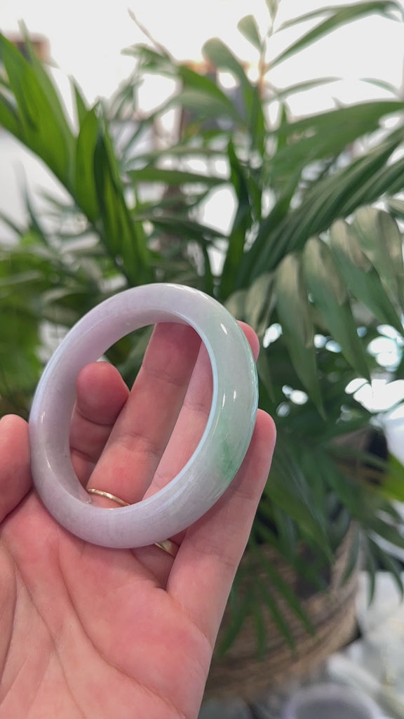 * DETAILS--- This bangle is crafted from genuine Burmese Jadeite jade. It features a semi smooth texture, with light lavender-green and apple green flower colors. The vibrant green patch and the semi translucent lavender hues are truly a mesmerizing combination. This bangle is characterized by beautiful vibrant green patches. Minor cloudy spots through out and no natural lines. Known for its durability, jadeite is also believed to bring good luck. This bangle makes a thoughtful and meaningful gift for yourself or someone special.