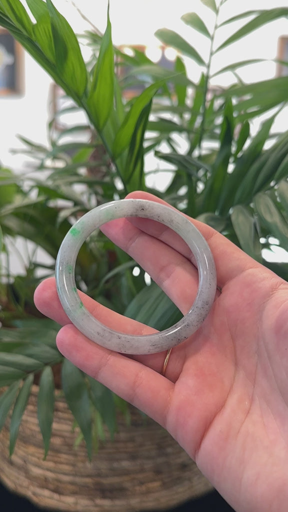 * DETAILS--- This beautiful bangle is made from natural Burmese Jadeite jade, featuring very smooth texture, with beautiful dark WuJi (乌鸡) "black chicken" a blackish grey tone through out and a patch of vibrant green color. It's a full round, traditional fit bangle, which gives the bangle a more dainty, petite look for everyday wear. This bangle has a very icy texture, overall with some cloudy spots and no natural lines. This is really unique color to come by for Burmese jadeite jade. A timeless piece, perfect as a thoughtful gift for yourself or someone truly special.
