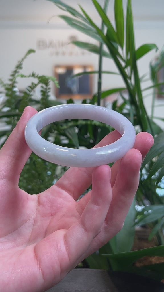 *DETAILS--- This bangle is crafted from natural Burmese Jadeite jade that features a light lavender and light green color throughout. The texture is smooth and translucent with minimal natural lines and cloudy spots. Designed in a half-round, comfort-fit style, the bangle is flat on the inside for a comfortable feel, perfect for everyday wear. Known for its durability, jadeite is also cherished as a symbol of good luck, protection, and harmony. Whether as a gift for yourself or a loved one, this jade bangle is a meaningful treasure that combines natural beauty, lasting craftsmanship, and exceptional value to cherish for years to come.