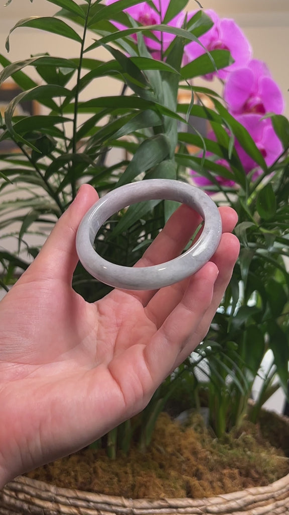 * DETAILS--- This bangle is crafted from genuine Burmese Jadeite jade that features a light lavender color with grey Wuji "black-chicken", and a patch of faint green. The texture is semi-smooth with very minimal natural lines and minimal cloudy spots.