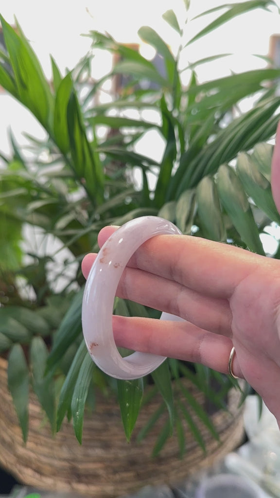 * DETAILS--- Genuine Burmese Jadeite Jade Bangle Bracelet. This bangle features a soft light lavender color and a smooth, translucent texture with SaJin "Golden Dust" specks that looks very beautiful and unique. Has a little natural lines and cloudy texture. It's a half round, comfort-fit bangle, which is flat on the inside of the bangle and comfortable for everyday wear. Known for its durability, jadeite is also believed to bring good luck. This bangle makes a thoughtful and meaningful gift for yourself or someone special.