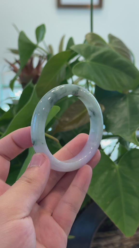 * DETAILS--- Genuine Burmese Jadeite Jade Bangle Bracelet. This bangle is made with genuine Burmese icy lavender and blue-green Jadeite jade. The jade texture is fine and translucent. With some small spots of cloudy inclusion. The bangle has some very beautiful blue-green color inside with lavender. The two color with the translucent texture are a truly a mesmerizing combination. The Classic half round style bracelet.