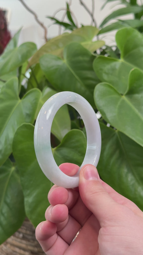 * DETAILS---This jade bangle is made from fine Burmese jadeite, featuring a soft light lavender and green tone. Its smooth finish gives it a clean, classic look. The half-round shape is comfortable and brings out the natural beauty of the jade. A graceful and meaningful piece — perfect as a gift or a special treat for yourself.