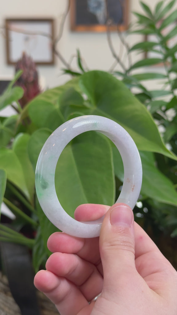 * DETAILS--- This jade bangle is made from high-quality genuine Burmese green Jadeite jade. It has a translucent texture with beautiful green colors, creating a stunning look. The classic half-round design is elegant, with hints of cloud-like patterns inside. The bangle features vibrant green patches and multiple colors, making it a unique and special gift for you and someone you love. It’s also a great collectible item.