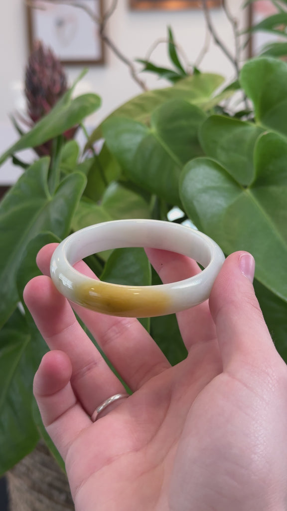 * DETAILS---This beautiful jade bangle is made from fine Burmese jadeite with a soft mix of yellow and green. It has a smooth and translucent texture , looks very unique, The classic half-round shape is comfortable to wear and highlights the natural beauty of the jade. this bangle is a meaningful and affordable gift — perfect for yourself or someone special.