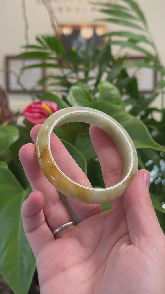 * DETAILS--This bangle is made from quality genuine Burmese Jadeite jade. It has a light green base with yellowish - red colors. The classic half-round design offers comfort and style. Jadeite jade is one of the toughest gemstones, and it's believed to bring good luck. This bangle makes a special gift for you or a loved one.
