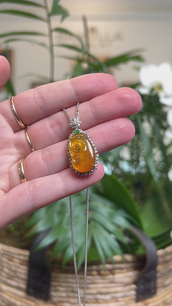 * Design Concept--- This pendant is crafted from genuine, natural Burmese jadeite jade, displaying a rich icy orange-red hue with a smooth, translucent texture. Elegantly set in 18K white gold, it is accented with natural diamonds and crowned with an imperial green jade stone at the top center. The back of the 18K gold setting features an opening, revealing the jade’s icy translucence, while the pendant is completed with a lotus-inspired gold bail, adorned with sparkling natural diamonds.