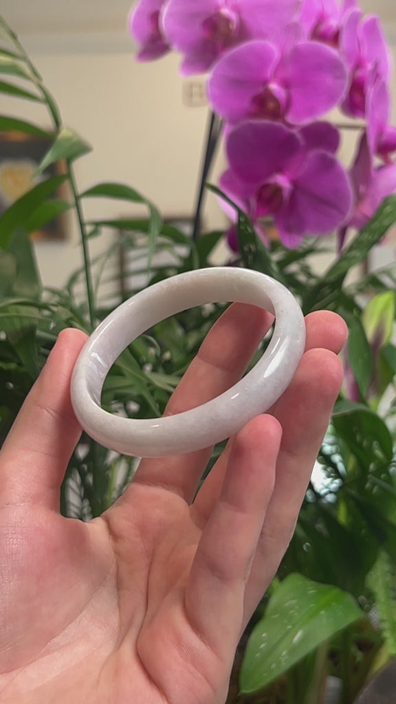 *DETAILS--- This bangle is crafted from genuine Burmese Jadeite jade that features a a blend of white-lavender and light green throughout. The texture is semi-smooth and translucent with minimal natural lines and cloudy spots.