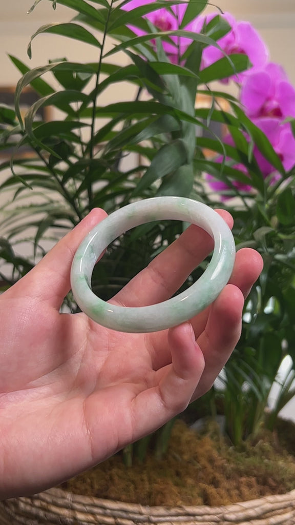 * DETAILS--- This bangle is crafted from genuine Burmese Jadeite jade that features a white-green base color with vibrant green flowers throughout. The texture is semi-smooth with some natural lines and minimal cloudy spots.