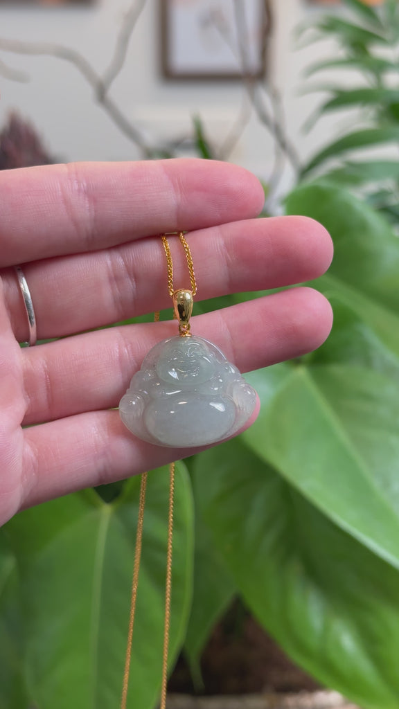 *Design concept--- This lovely pendant is made from icy blue-green jadeite jade with expert carving and an ice-like texture. Wearing a Happy Buddha pendant is believed to bring positive energy and joy. It symbolizes letting go of negativity and staying strong. "Buddha" means "enlightened one," offering guidance and protection. For those who follow Buddhism, this pendant represents good fortune and prosperity, making it a meaningful choice for daily wear.