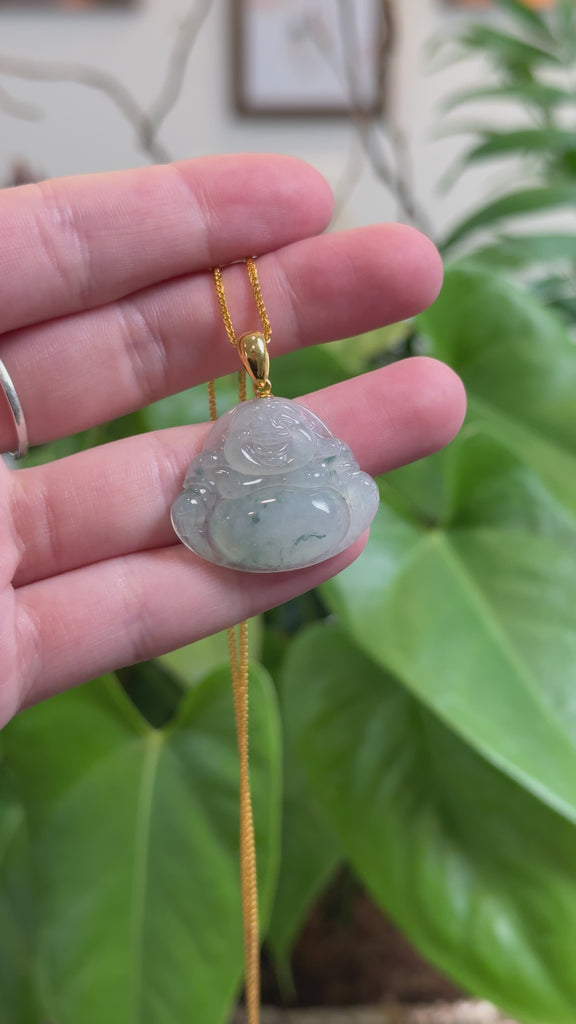 *Design concept--- This lovely pendant is made from icy blue-green jadeite jade with expert carving and an ice-like texture. Wearing a Happy Buddha pendant is believed to bring positive energy and joy. It symbolizes letting go of negativity and staying strong. "Buddha" means "enlightened one," offering guidance and protection. For those who follow Buddhism, this pendant represents good fortune and prosperity, making it a meaningful choice for daily wear.