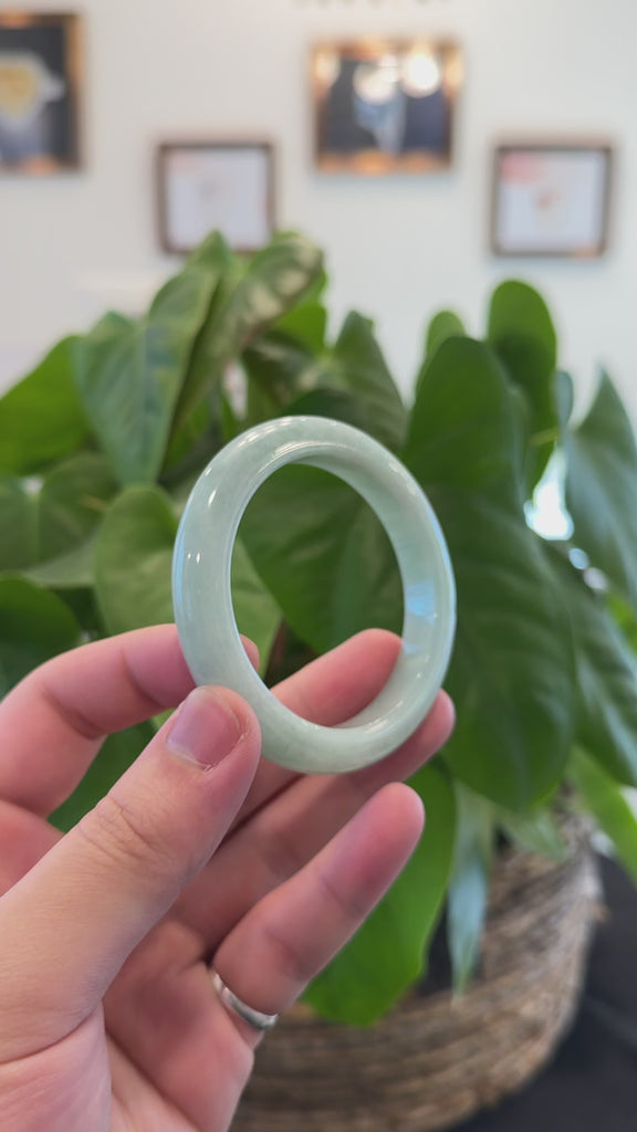 * DETAILS---This exquisite bangle is crafted from premium Burmese jadeite in an apple green. With its smooth, translucent texture and captivating color, it radiates a timeless elegance and cultural heritage. The half round comfort design enhances the jade’s natural beauty with clarity and simplicity, making this bracelet a cherished addition to any jewelry collection. Known to symbolize protection and strength, jade bangles hold deep meaning, making this piece a thoughtful, one-of-a-kind gift for yourself or someone truly special.