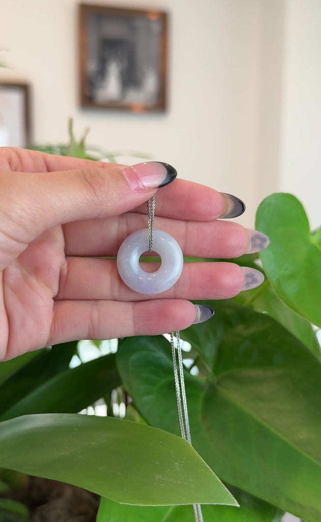 * Design Concept--- The simple shape of a circle represents things such as happiness, wholeness, and prosperity. Or as Sotheby's auction house called a jade bangle. "Circle of Heaven". This necklace is made with very high-quality genuine Burmese lavender jadeite jade. Which produces some fine jade. The texture is very old from the old mine. Gifting one of these is like wishing the best of luck to your family or loved ones.