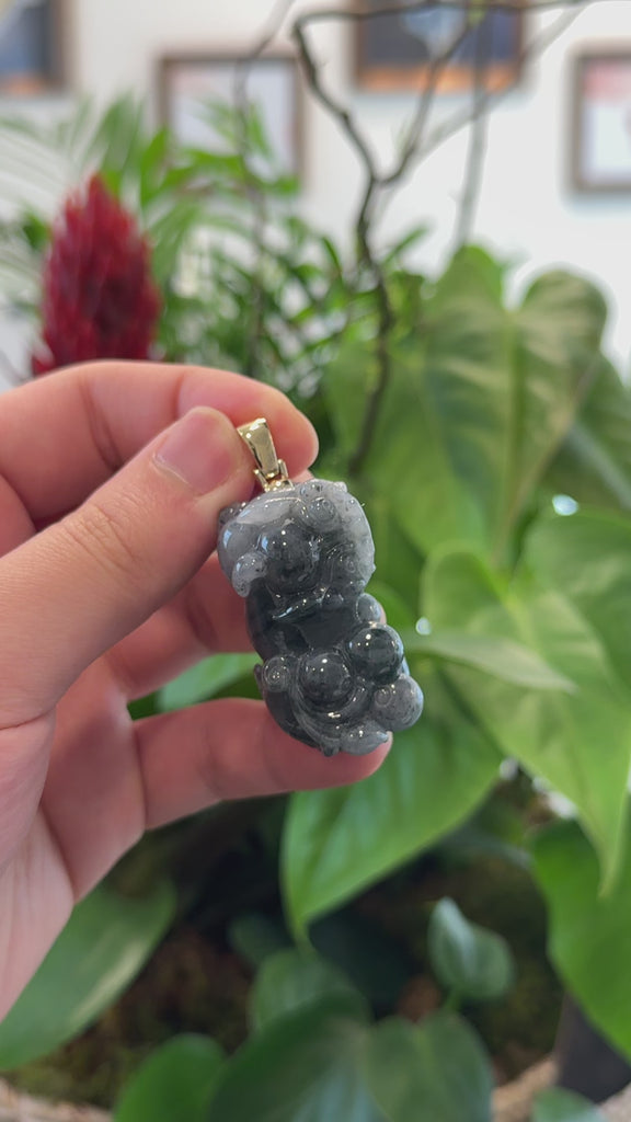 Genuine Burmese Blue-Green Jadeite Jade PiXiu Pendant Necklace With 18K Gold Bail