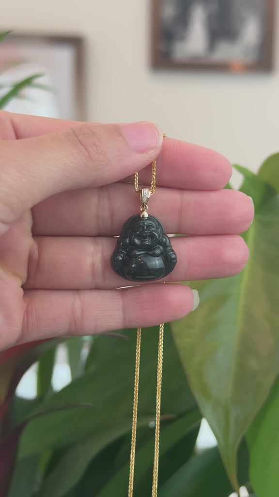 * DETAILS--- Introducing our 14K Yellow Gold Genuine Nephrite Black Jade "Happy Laughing Buddha" Pendant Necklace. Crafted from genuine dark green nephrite jade, this pendant boasts a smooth texture and excellent hand craftsmanship on both sides. The back side features intricate carvings of mystical spells. With its perfect blend of nephrite jade and gold bail, this pendant is both beautiful and affordable, making it a unique gift for yourself or someone special.