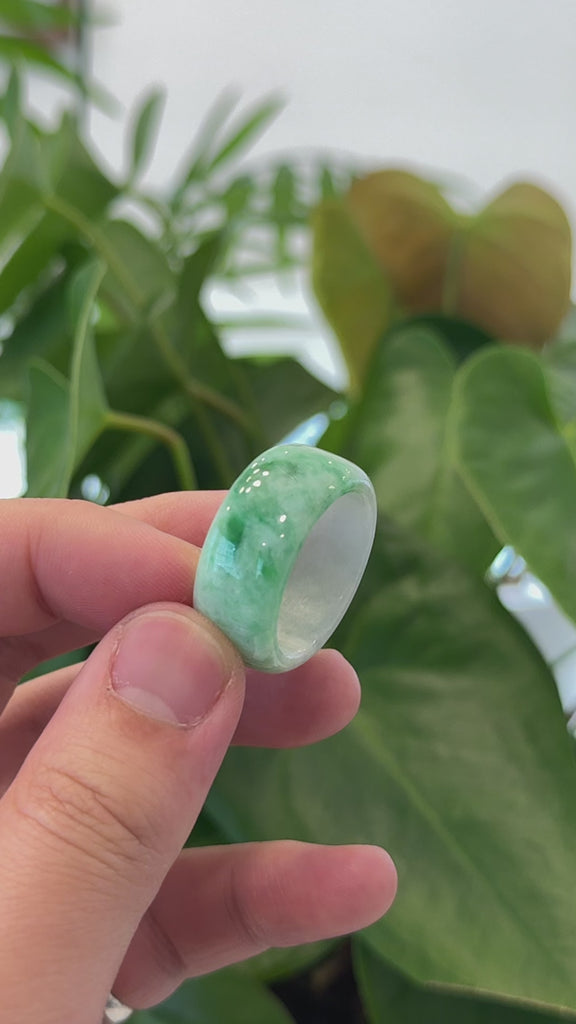 * DETAILS--- This ring is made with very high-quality genuine Burmese jadeite jade in a beautiful blend of vibrant apple green and white. The jade texture is smooth, clean, and semi-transparent. The green color and translucent white texture is truly a mesmerizing combination.  Known for its durability, jadeite is also believed to bring good luck. This ring makes a thoughtful and meaningful gift for yourself or someone special.