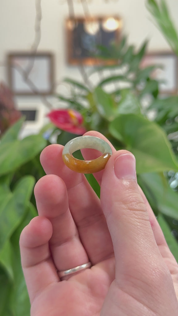 * DETAILS--- This ring is crafted from genuine multi color Burmese jadeite jade, showcasing a smooth ice texture with rich green and brown sugar patch. Its classic half-round design gives it the sleek look of a jade bangle for your finger, while natural brown sugar-like patches add to its unique beauty. A timeless and meaningful gift for both men and women.