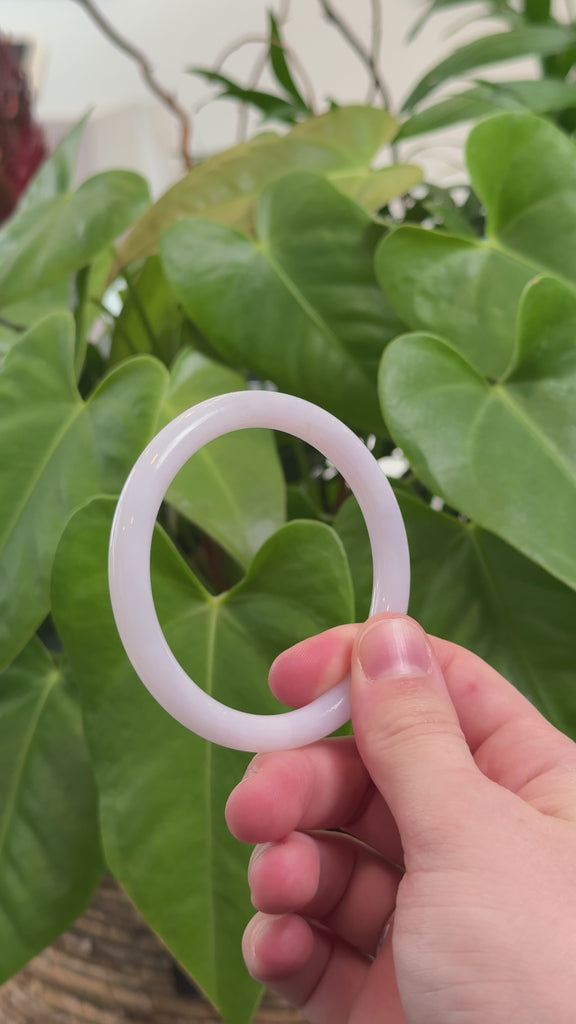 * DETAILS---This stunning jade bangle is crafted from fine Burmese jadeite in a soft lavender hue. Its smooth texture and timeless elegance make it truly eye-catching. The traditional round shape is a favorite for many, offering a classic and graceful look. With its petite design and gentle color, this bangle is more than just fine jewelry — it’s a meaningful gift, perfect for yourself or someone special.